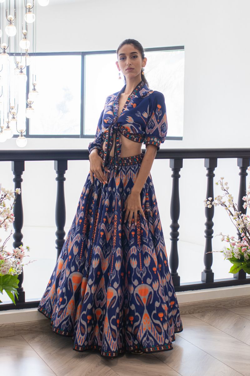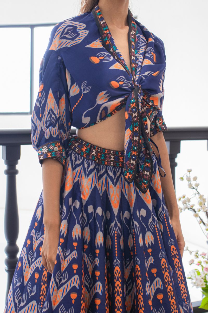 A bold fusion outfit with vibrant Ikat prints, featuring a tie-front blouse and voluminous skirt that exude contemporary charm.